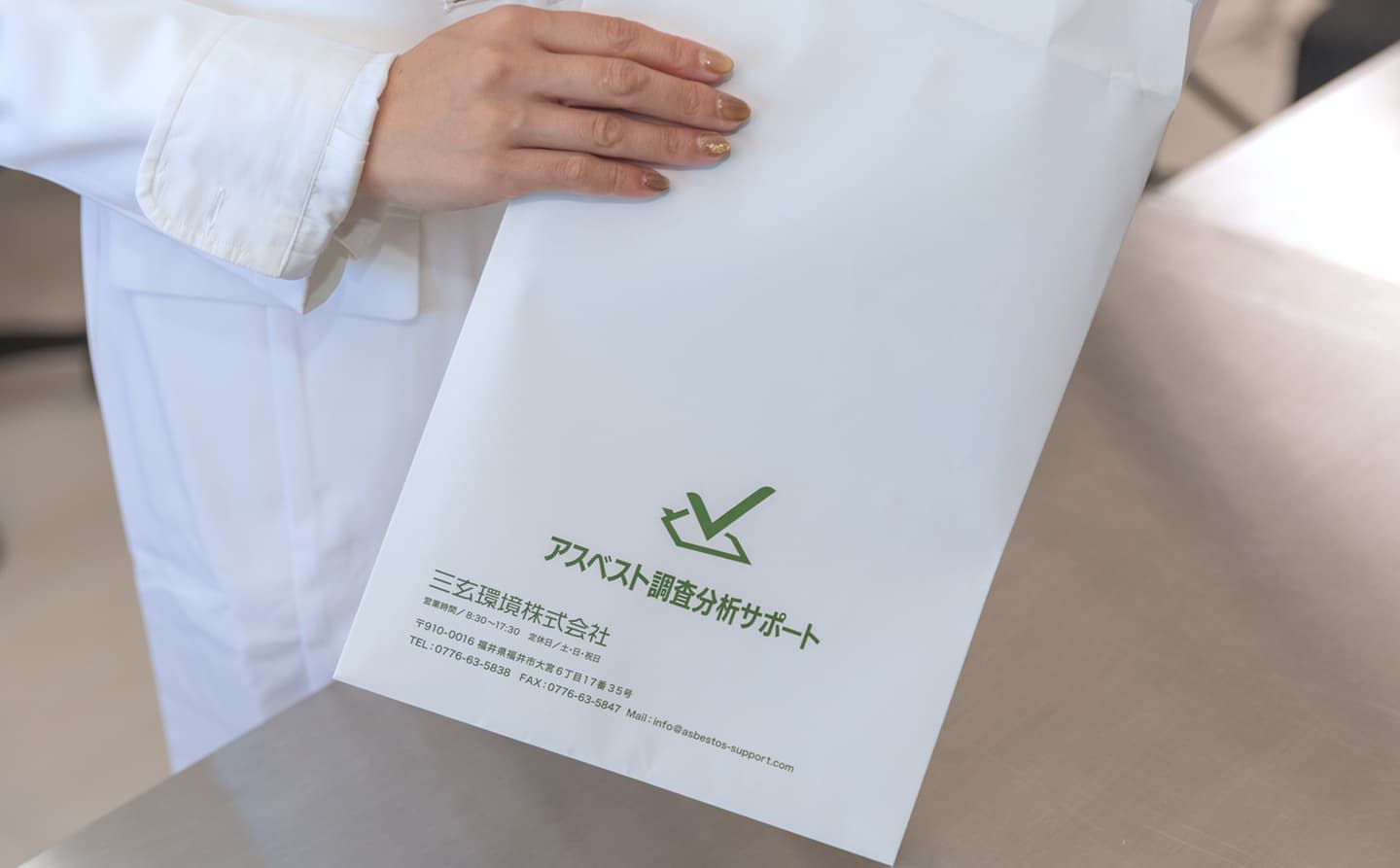 郵送いただいた検体について、三玄環境がアスベストの有無を分析します。お客様にて、確認が必要な検体を採取していただき、送付された検体を専門的に分析いたします。分析結果は、分析結果報告書として後日メールにて提出いたします。